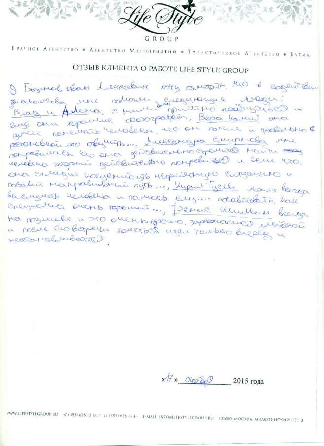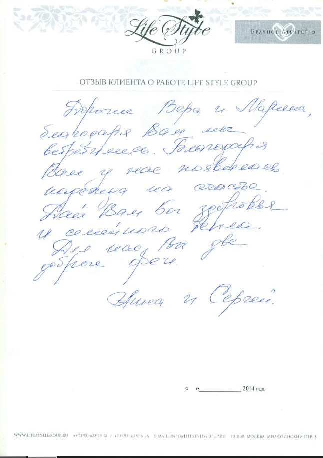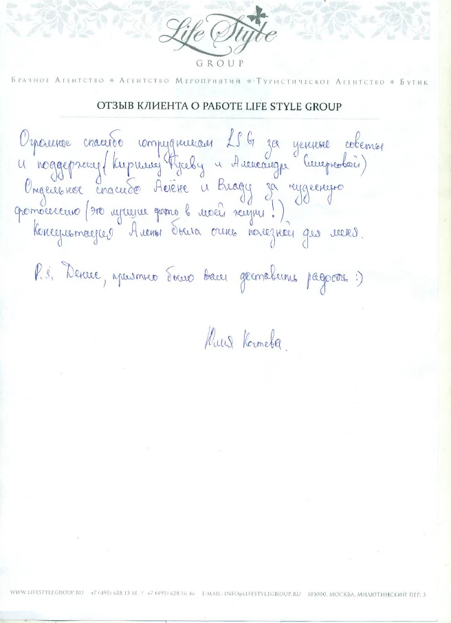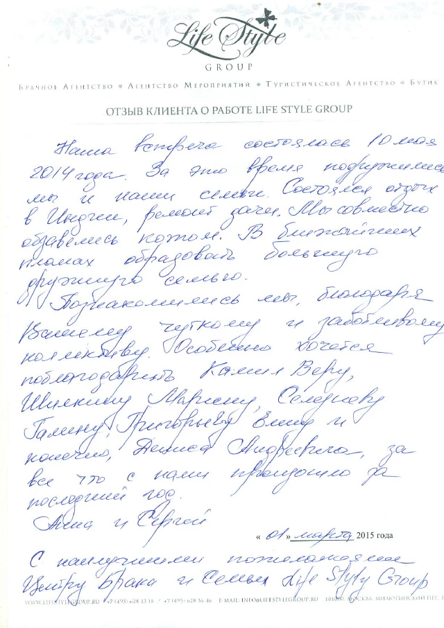 Life Style Group – современная компания свадебной индустрии, отличающаяся от существующих служб знакомств и брачных агентств, собственными эффективными методиками и технологиями, созданными на основе российского и международного опыта в области семейной психологии и коучинга, детальным анализом запросов каждого Клиента и современного рынка услуг, регулярным контролем качества и динамичностью, а также строгой приверженностью к высокими стандартам сервиса, которые позволяют нам быть впереди и превосходить ожидания Клиентов!